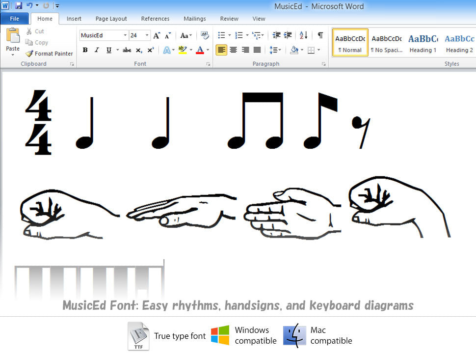 With the Music Ed font for PC and Mac, easily and effortlessly create basic musicianship materials without the cost and hassle of music notation software. Perfect for Kodály stick notation, simple worksheets, transparencies, and exams. Only your imagination limits the possibilities.